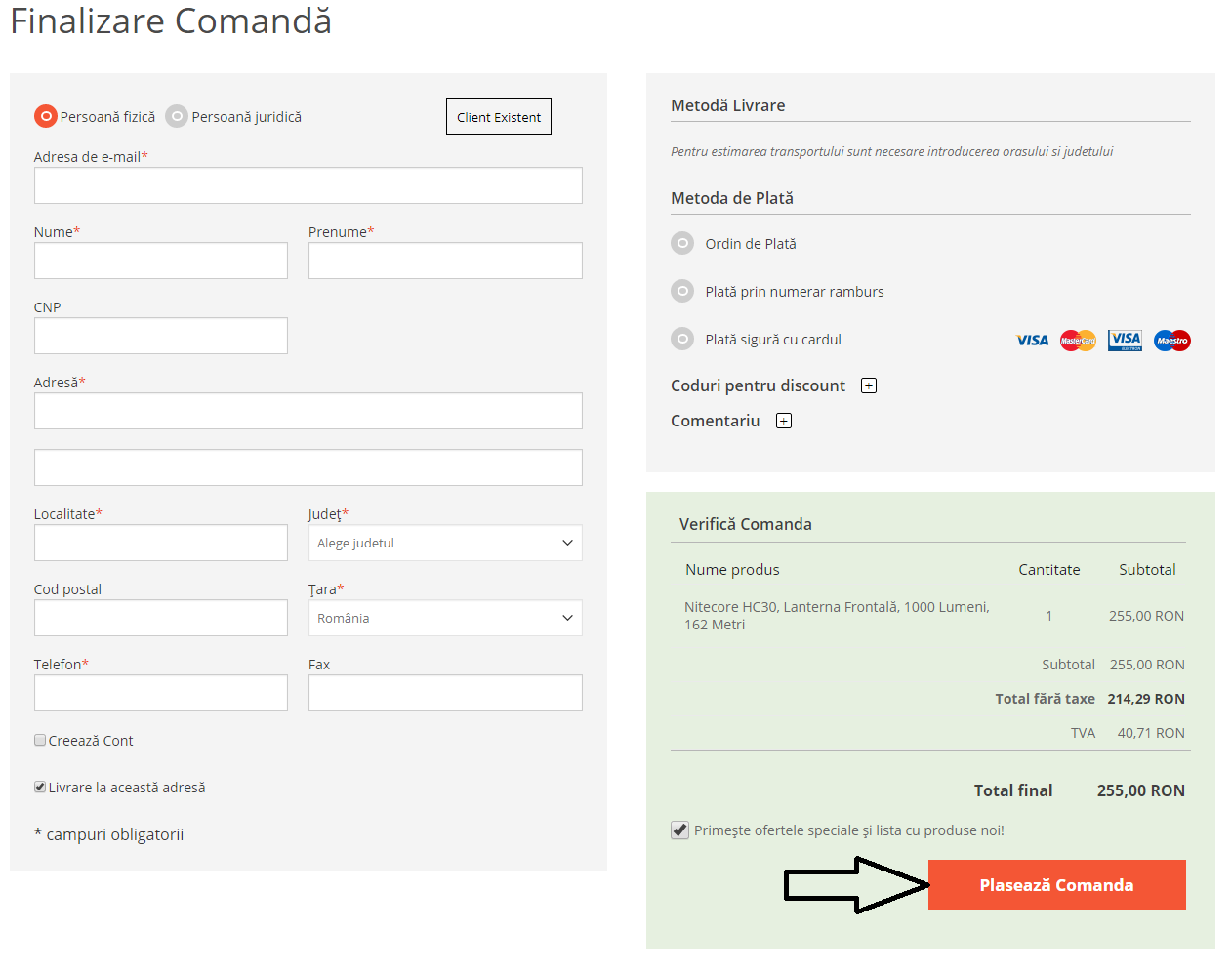 Pentru a continua procesul de achiziție, trebuie să introduceți datele de facturare. În cazul în care doriți să achiziționați prin intermediul unei persoane juridice, selectați opțiunea corespunzătoare și vor apărea câmpurile suplimentare de completat. De asemenea, Dacă doriți ca livrarea produselor să se efectueze la o altă adresă decât cea de pe factură, puteți să debifati opțiunea "Livrare la aceasta adresă". De asemenea, trebuie să alegeți metoda de plată, card, transfer bancar sau numerar ramburs pentru a continua procesul, apăsați butonul "Plaseaza Comanda". Vă rugăm să vă asigurați că datele sunt corecte și că ați completat toate câmpurile obligatorii înainte de a trece mai departe.